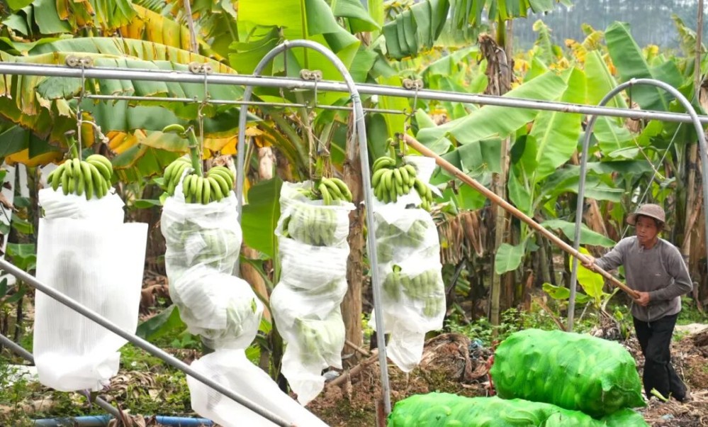 “以前人工運輸真是難,120~150斤重的香蕉要肩扛著鉆山林,效率低還容易碰傷?!被刎撠熑朔街救A介紹,今年5月,他們外出參觀后,引入了無人機吊運團隊。經實操驗證,無人機不僅減少香蕉損耗、提升品質,還徹底解決山地運輸難題。相較于人工運輸的耗時費力,無人機運輸使效率提升1至2個小時,一天可吊運5萬斤香蕉,大大減輕了工人負擔。
