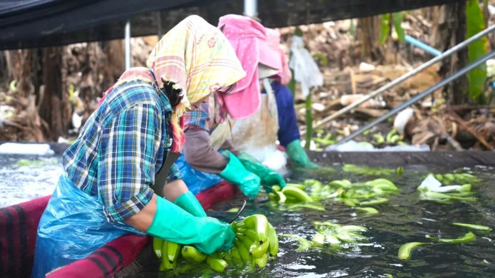 分揀大棚內,十余名工人分工協作,將大串香蕉分割成小份后用清水仔細沖洗果皮上的雜質,挑出品相不佳的次品,熟練地為合格香蕉套上保鮮袋、裝入紙箱中。剛裝箱的香蕉通體翠綠,散發著清新草木香,而一旁單獨擺放的幾串熟蕉,已染上誘人的金黃色。大棚外,來自東北的收購商早已等候多時,對著豐收的果實滿臉笑意。